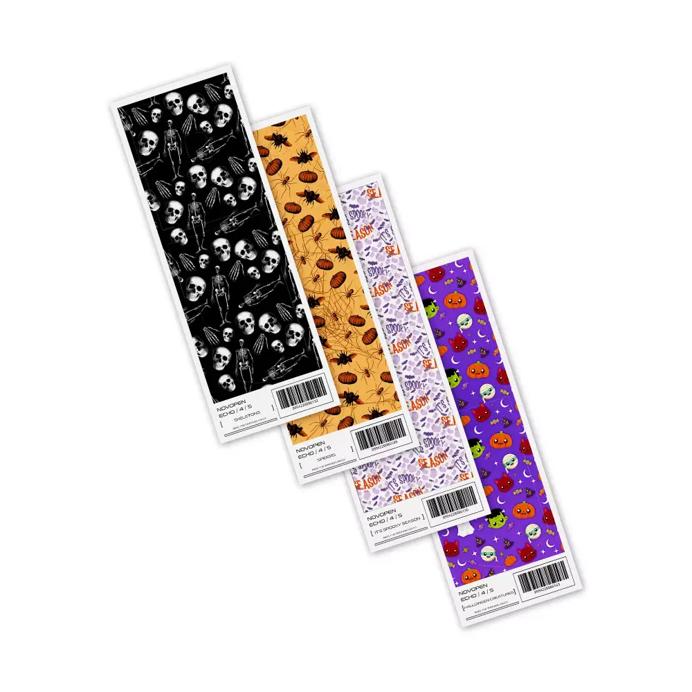 Transform your Novopen Echo with the Novopen Echo Stickers - Halloween 2024 collection! Choose from an array of Halloween-themed designs, including skeletons, spiders, and webs on bold backgrounds, or playful creatures like pumpkins and ghosts. Each set of stickers is crafted from durable, non-removable vinyl that protects your pen from scratches while adding a festive flair. With themes like ‘It’s Spooky Season’ and other Halloween classics, these stickers are designed to stay in place and last throughout the season, ensuring your Novopen Echo remains stylish and secure.